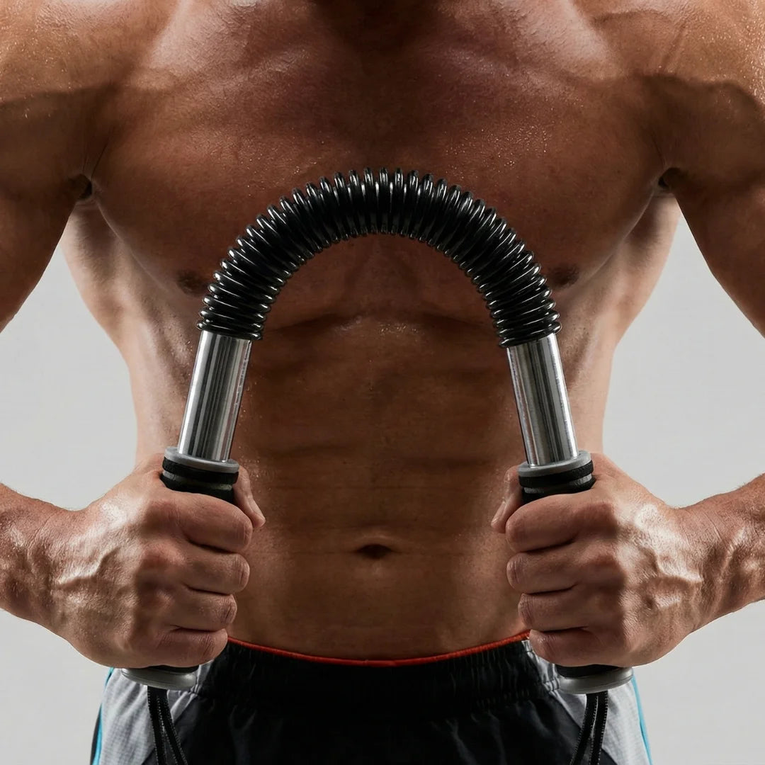 Flexible high-carbon steel spring bar with safety straps for chest and arm isometrics.